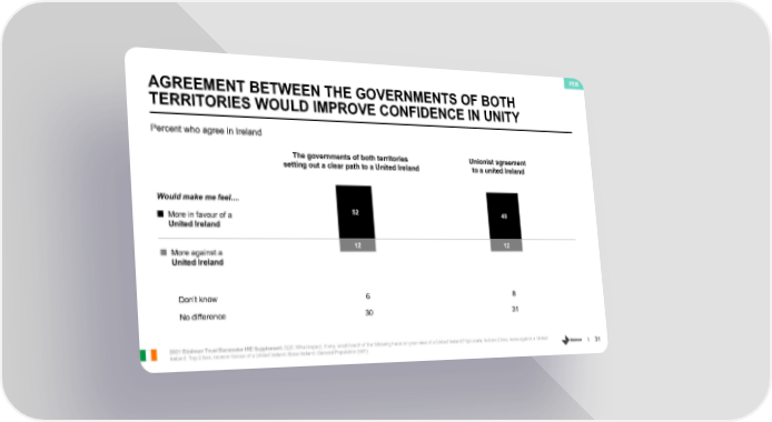 FEB AGREEMENT BETWEEN THE GOVERNMENTS OF BOTH TERRITORIES WOULD IMPROVE CONFIDENCE IN UNITY Percent who agree in Ireland The governments of both territories Unionist agreement setting out a clear path to a United Ireland to a united Ireland Would make me feel.... More in favour of a 52 48 United Ireland More against a 12 12 United Ireland Don’t know 6 8 No difference 30 31 2021 Edelman Trust Barometer IRE Supplement. Q20. What impact, if any, would each of the following have on your view of a United Ireland? 5pt scale; bottom 2 box, more against a United Ireland. Top 2 box, more in favour of a United Ireland. Base Ireland: General Population (501) 31