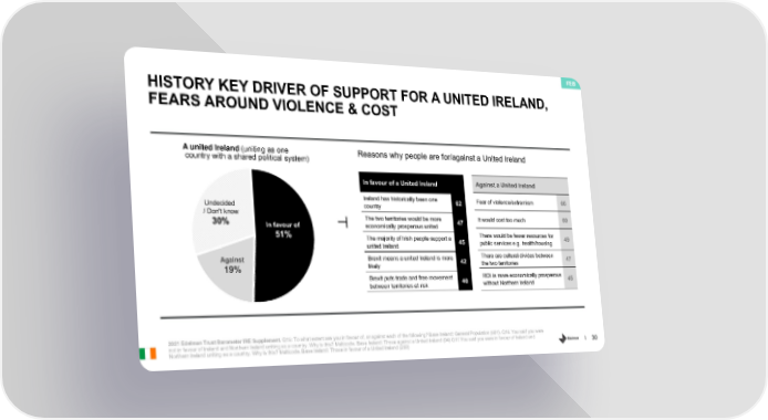 FEB HISTORY KEY DRIVER OF SUPPORT FOR A UNITED IRELAND, FEARS AROUND VIOLENCE & COST A united Ireland (uniting as one Reasons why people are for/against a United Ireland country with a shared political system) In favour of a United Ireland Against a United Ireland Ireland has historically been one 62 Fear of violence/extremism 66 Undecided country / Don't know The two territories would be more It would cost too much 60 30% In favour of economically prosperous united 47 51% The majority of Irish people support a There would be fewer resources for 49 united Ireland 45 public services e.g. health/housing Against Brexit means a united Ireland is more 42 There are cultural divides between 47 19% likely the two territories Brexit puts trade and free movement 40 ROI is more economically prosperous 45 between territories at risk without Northern Ireland 2021 Edelman Trust Barometer IRE Supplement. Q15: To what extent are you in favour of, or against each of the following? Base Ireland: General Population (501). Q16. You said you were not in favour of Ireland and Northern Ireland uniting as a country. Why is this? Multicode. Base Ireland: Those against a United Ireland (94) Q17.You said you were in favour of Ireland and Northern Ireland uniting as a country. Why is this? Multicode. Base Ireland: Those in favour of a United Ireland (259) 30