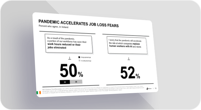 PANDEMIC ACCELERATES JOB LOSS FEARS Percent who agree, in Ireland As a result of the pandemic, I worry that the pandemic will accelerate a portion of our workforce has seen their the rate at which companies replace work hours reduced or their human workers with AI and robots jobs eliminated A large percentage A small percentage 50% 52% 22 28 2021 Edelman Trust Barometer. LAY_OFFS. Has the organization you work for had to lay-off or furlough any employees as a result of the economic impact of the pandemic? Code 1, yes, a large percentage; code 2, yes, a small percentage. Question asked of those who are an employee (Q43/1). Total layoff/furlough percentage is a sum of code 1 and 2. SOC_AGR. Please indicate how much you agree or disagree with the following statements. 9-point scale; top 4 box, agree. Question asked of half of the sample. General population, Ireland. 13
