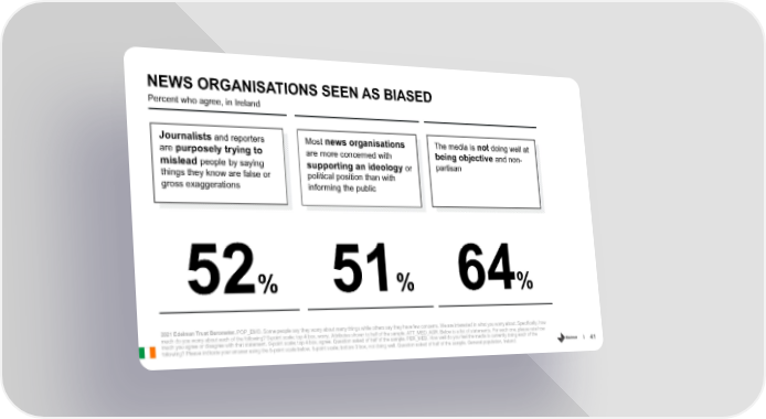 NEWS ORGANISATIONS SEEN AS BIASED Percent who agree, in Ireland Journalists and reporters Most news organisations The media is not doing well at are purposely trying to are more concerned with being objective and non- people by saying partisan mislead supporting an ideology or things they know are false or political position than with gross exaggerations informing the public 52% 51% 64% 2021 Edelman Trust Barometer. POP_EMO. Some people say they worry about many things while others say they have few concerns. We are interested in what you worry about. Specifically, how much do you worry about each of the following? 9-point scale; top 4 box, worry. Attributes shown to half of the sample. ATT_MED_AGR. Below is a list of statements. For each one, please rate how much you agree or disagree with that statement. 9-point scale; top 4 box, agree. Question asked of half of the sample. PER_MED. How well do you feel the media is currently doing each of the following? Please indicate your answer using the 5-point scale below. 5-point scale; bottom 3 box, not doing well. Question asked of half of the sample. General population, Ireland. 41