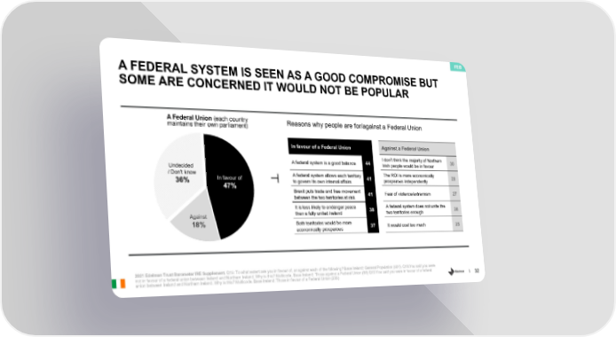FEB A FEDERAL SYSTEM IS SEEN AS A GOOD COMPROMISE BUT SOME ARE CONCERNED IT WOULD NOT BE POPULAR A Federal Union (each country Reasons why people are for/against a Federal Union maintains their own parliament) In favour of a Federal Union Against a Federal Union A federal system is a good balance 44 I don’t think the majority of Northern 30 Undecided Irish people would be in favour / Don't know In favour of A federal system allows each territory 41 The ROI is more economically 28 36% 47% to govern its own internal affairs prosperous independently Brexit puts trade and free movement 41 Fear of violence/extremism 27 between the two territories at risk It is less likely to endanger peace 38 A federal system does not unite the 26 Against than a fully united Ireland two territories enough 18% Both territories would be more 37 It would cost too much 25 economically prosperous 2021 Edelman Trust Barometer IRE Supplement. Q15: To what extent are you in favour of, or against each of the following? Base Ireland: General Population (501). Q18.You said you were not in favour of a federal union between Ireland and Northern Ireland. Why is this? Multicode. Base Ireland: Those against a Federal Union (88) Q19.You said you were in favour of a federal union between Ireland and Northern Ireland. Why is this? Multicode. Base Ireland: Those in favour of a Federal Union (235) 32