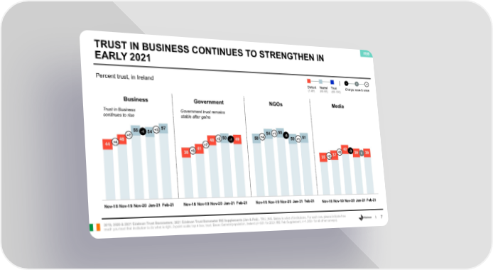 TRUST IN BUSINESS CONTINUES TO STRENGTHEN IN FEB EARLY 2021 Percent trust, in Ireland Distrust Neutral Trust - 0 + (1-49) (50-59) (60-100) Change, wave to wave Business Government NGOs Media Trust in Business Government trust remains continues to rise stable after gains 55 -1 54 +3 57 54 +1 55 +7 50 50 +4 -5 50 +1 51 48 48 +2 -1 49 44 +4 +7 38 +3 41 +5 42 -3 39 39 35 +2 37 0 Nov-18 Nov-19 Nov-20 Jan-21 Feb-21 Nov-18 Nov-19 Nov-20 Jan-21 Feb-21 Nov-18 Nov-19 Nov-20 Jan-21 Feb-21 Nov-18 Nov-19 Nov-20 Jan-21 Feb-21 2019, 2020 & 2021 Edelman Trust Barometers; 2021 Edelman Trust Barometer IRE Supplements (Jan & Feb) . TRU_INS. Below is a list of institutions. For each one, please indicate how much you trust that institution to do what is right. 9-point scale; top 4 box, trust. Base: General population, Ireland.(n=501 for 2021 IRE Feb Supplement, n=1,000+ for all other surveys). 7