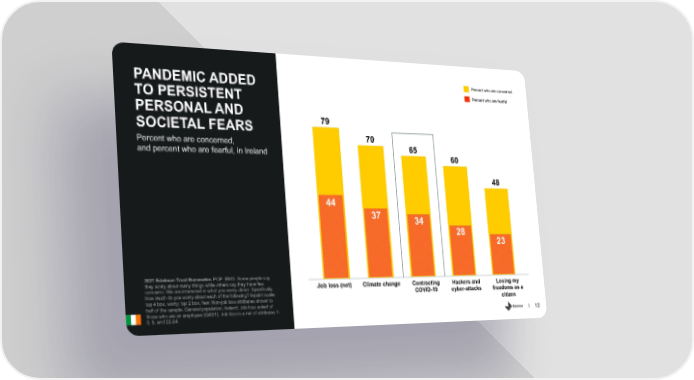 PANDEMIC ADDED Percent who are concerned TO PERSISTENT Percent who are fearful PERSONAL AND 79 SOCIETAL FEARS 70 Percent who are concerned, 65 and percent who are fearful, in Ireland 60 48 44 37 34 28 23 2021 Edelman Trust Barometer. POP_EMO. Some people say they worry about many things while others say they have few Job loss (net) Climate change Contracting Hackers and Losing my concerns. We are interested in what you worry about. Specifically, COVID-19 cyber-attacks freedoms as a how much do you worry about each of the following? 9-point scale; top 4 box, worry; top 2 box, fear. Non-job loss attributes shown to citizen half of the sample. General population, Ireland. Job loss asked of those who are an employee (Q43/1). Job loss is a net of attributes 1- 3, 5, and 22-24. 12