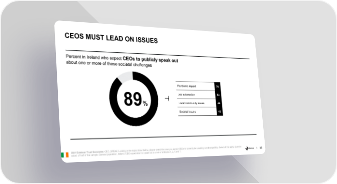 CEOS MUST LEAD ON ISSUES Percent in Ireland who expect CEOs to publicly speak out about one or more of these societal challenges Pandemic impact 70 Job automation 53 89% Local community issues 44 Societal issues 43 2021 Edelman Trust Barometer. CEO_SPEAK. Looking at the topics listed below, please select the ones you expect CEOs to currently be speaking out about publicly. Select all that apply. Question asked of half of the sample. General population, Ireland. CEO expectation to speak out is a net of attributes 1, 2, 5 and 7. 35
