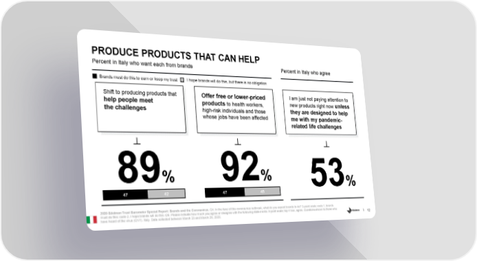 PRODUCE PRODUCTS THAT CAN HELP Percent in Italy who want each from brands Percent in Italy who agree Brands must do this to earn or keep my trust I hope brands will do this, but there is no obligation Shift to producing products that I am just not paying attention to Offer free or lower-priced help people meet new products right now unless products to health workers, the challenges high-risk individuals and those they are designed to help whose jobs have been affected me with my pandemic- related life challenges 89% 92% 53% 47 42 47 45 2020 Edelman Trust Barometer Special Report: Brands and the Coronavirus. Q4. In the face of this coronavirus outbreak, what do you expect brands to do? 3-point scale; code 1, brands must do this; code 2, I hope brands will do this. Q6. Please indicate how much you agree or disagree with the following statements. 9-point scale; top 4 box, agree. Questions shown to those who 12 have heard of the virus (Q1/1). Italy. Data collected between March 23 and March 26, 2020.