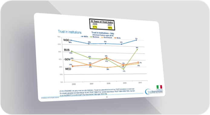 15 Years of Trust Index 2006 2021 47% 66% Trust in institutions Trust in institutions – Italy Informed Publics ages 35-64 70% NGOs Business Government Media 70% 63% 63% NGO 62% 66% 60% 56% BUS 50% 51% 43% 42% 39% 40% GOV 41% 37% 33% 33% 31% 35% 30% 32% 32% MED 29% 27% 20% 10% 2006 2007 2008 2009 2010 A7-A10. [TRACKING] I am going to read you a list of institutions. For each one, please tell me how much you TRUST that institution to do what is right. On a 9-point scale where one means that you “DO NOT TRUST THEM AT ALL” and nine means that you “TRUST THEM A GREAT DEAL, how much do you trust [INSERT] to do what is right? (Top 4 Box) Informed Publics ages 35-64 in Italy 23