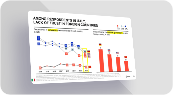 AMONG RESPONDENTS IN ITALY, LACK OF TRUST IN FOREIGN COUNTRIES Distrust Neutral Trust (1-49) (50-59) (60-100) Percent trust in companies headquartered in each country, Percent trust in the national government of each in Italy foreign country, in Italy 75 72 66 64 63 62 61 49 58 57 55 52 38 48 48 45 32 44 23 29 29 28 25 25 2014 2015 2016 2017 2018 2019 2020 2021 2021 Edelman Trust Barometer. TRU_NAT. Now we would like to focus on global companies headquartered in specific countries. Please indicate how much you trust global companies headquartered in the following countries to do what is right. 9-point scale; top 4 box, trust. Question asked of half of the sample. TRU_GOV. Please indicate how much you trust the national government of each of the following countries to do what is right using a 9-point scale where one means that you “do not trust them at all” and nine means that you “trust them a great deal”. 9- 24 point scale; top 4 box, trust. Question asked of half of the sample. Respondents were not asked to rate their home country. General population, Italy.