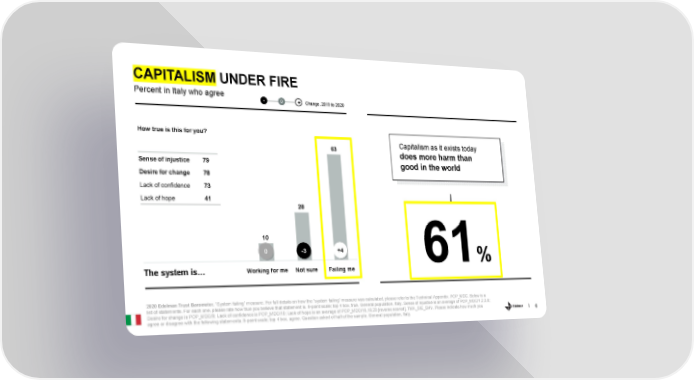 CAPITALISMUNDER FIRE Percent in Italy who agree + - 0 Change, 2019 to 2020 How true is this for you? Capitalism as it exists today 63 does more harm than Sense of injustice 79 good in the world Desire for change 78 Lack of confidence 73 Lack of hope 41 28 10 0 -3 +4 61% Working for me Not sure Failing me The system is… 2020 Edelman Trust Barometer. “System failing” measure. For full details on how the “system failing” measure was calculated, please refer to the Technical Appendix. POP_MDC. Below is a list of statements. For each one, please rate how true you believe that statement is. 9-point scale; top 4 box, true. General population, Italy. Sense of injustice is an average of POP_MDC/1,2,3,8; Desire for change is POP_MDC/9; Lack of confidence is POP_MDC/10; Lack of hope is an average of POP_MDC/18,19,20 [reverse scored]. TMA_SIE_SHV. Please indicate how much you 6 agree or disagree with the following statements. 9-point scale; top 4 box, agree. Question asked of half of the sample. General population, Italy.
