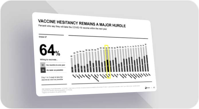 VACCINE HESITANCY REMAINS A MAJOR HURDLE Percent who say they will take the COVID-19 vaccine within the next year Global 27 80 76 75 74 73 72 71 71 70 69 69 68 66 66 66 65 65 65 62 59 59 58 58 54 54 52 49 64% 40 Willing to vaccinate… 43 45 45 48 51 42 31 Six months to one year 32 33 33 32 35 33 35 39 39 35 39 39 21 24 23 26 28 24 28 15 18 18 33 As soon as possible Only 1 in 3 ready to take the vaccine as soon as possible 2021 Edelman Trust Barometer. VACCINE1. If and when a COVID-19 vaccine becomes available will you take it? Code 1, yes as soon as possible; code 2, yes, within a year. Question asked of half of the sample. General population, 27-mkt avg. 40 *Nigeria not included in the global average