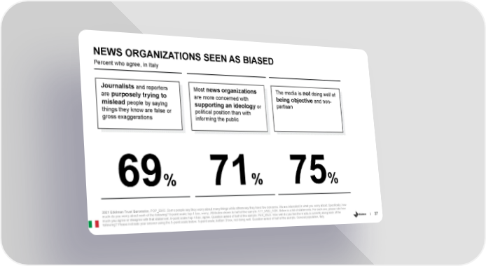 NEWS ORGANIZATIONS SEEN AS BIASED Percent who agree, in Italy Journalists and reporters Most news organizations The media is not doing well at are purposely trying to are more concerned with being objective and non- partisan mislead people by saying supporting an ideology or things they know are false or political position than with gross exaggerations informing the public 69% 71% 75% 2021 Edelman Trust Barometer. POP_EMO. Some people say they worry about many things while others say they have few concerns. We are interested in what you worry about. Specifically, how much do you worry about each of the following? 9-point scale; top 4 box, worry. Attributes shown to half of the sample. ATT_MED_AGR. Below is a list of statements. For each one, please rate how much you agree or disagree with that statement. 9-point scale; top 4 box, agree. Question asked of half of the sample. PER_MED. How well do you feel the media is currently doing each of the 37 following? Please indicate your answer using the 5-point scale below. 5-point scale; bottom 3 box, not doing well. Question asked of half of the sample. General population, Italy.