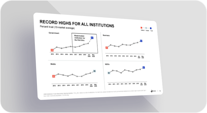 RECORD HIGHS FOR ALL INSTITUTIONS Distrust Neutral Trust Percent trust (10-market average) Government Business Most-trusted 63 institution for 62 the first time 45 36 2012 2013 2014 2015 2016 2017 2018 2019 Jan May 2012 2013 2014 2015 2016 2017 2018 2019 Jan May 2020 2020 2020 2020 Media NGOs 62 55 51 46 2012 2013 2014 2015 2016 2017 2018 2019 Jan May 2012 2013 2014 2015 2016 2017 2018 2019 Jan May 2020 2020 2020 2020 2020 Edelman Trust Barometer Spring Update. TRU_INS. Below is a list of institutions. For each one, please indicate how much you trust that institution to do what is right. 9-point scale; top 4 19 box, trust. General population, 10-mkt avg.