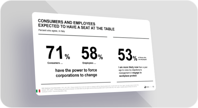 CONSUMERS AND EMPLOYEES EXPECTED TO HAVE A SEAT AT THE TABLE Percent who agree, in Italy of those who 71% 58% are employed 53% Consumers … Employees … I am more likely now than a year ago to voice my objections to have the power to force management or engage in corporations to change workplace protest 2021 Edelman Trust Barometer. TMA_SIE_SHV. Please indicate how much you agree or disagree with the following statements. 9-point scale; top 4 box, agree. Question asked of half of the sample. EMP_ENG. Thinking about your current employer, to what extent do you agree with the following statements? 9-point scale; top 4 box, agree. Question asked of those who are an 50 employee (Q43/1). General population, Italy.