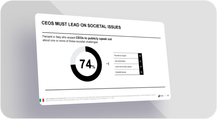 CEOS MUST LEAD ON SOCIETAL ISSUES Percent in Italy who expect CEOs to publicly speak out about one or more of these societal challenges Pandemic impact 53 Job automation 31 Local community issues 27 74% Societal issues 24 2021 Edelman Trust Barometer. CEO_SPEAK. Looking at the topics listed below, please select the ones you expect CEOs to currently be speaking out about publicly. Select all that apply. Question 45 asked of half of the sample. General population, Italy. CEO expectation to speak out is a net of attributes 1, 2, 5 and 7.