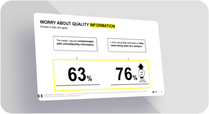 WORRY ABOUT QUALITY INFORMATION Percent in Italy who agree The media I use are contaminated I worry about false information or fake with untrustworthy information news being used as a weapon +6 pts 63% 76% Change, 2018 to 2020 2020 Edelman Trust Barometer. ATT_MED_AGR. Below is a list of statements. For each one, please rate how much you agree or disagree with that statement. 9-point scale; top 4 box, agree. 10 Question asked of half of the sample. General population, Italy.