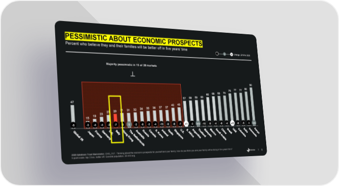 PESSIMISTIC ABOUT ECONOMIC PROSPECTS Percent who believe they and their families will be better off in five years’ time + - 0 Change, 2019 to 2020 Majority pessimistic in 15 of 28 markets 90 80 77 77 75 70 69 68 66 60 59 58 57 47 43 42 37 37 36 35 34 32 31 31 29 27 23 19 15 -5 -3 -4 -4 -2 -7 -9 0 -2 -6 -2 -4 -10 -9 -8 -7 +1 -2 n/a -10 -9 -4 -6 -4 +3 -8 -5 -3 n/a l llllllllllllllllllllllllllll 2020 Edelman Trust Barometer. CNG_FUT. Thinking about the economic prospects for yourself and your family, how do you think you and your family will be doing in five years’ time? 55 5-point scale; top 2 box, better off. General population, 26-mkt avg.