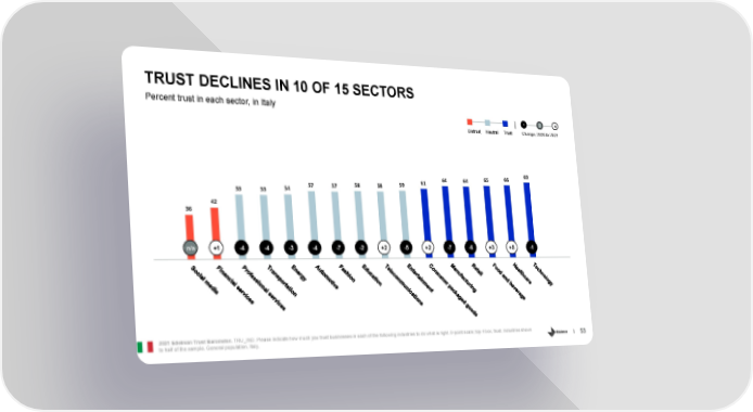 TRUST DECLINES IN 10 OF 15 SECTORS Percent trust in each sector, in Italy + - 0 Distrust Neutral Trust Change, 2020 to 2021 64 64 65 66 69 57 57 58 58 59 61 53 53 54 42 36 n/a +1 -4 -4 -3 -4 -7 -2 +2 -5 +2 -7 -6 +3 +5 -1 2021 Edelman Trust Barometer. TRU_IND. Please indicate how much you trust businesses in each of the following industries to do what is right. 9-point scale; top 4 box, trust. Industries shown 53 to half of the sample. General population, Italy.