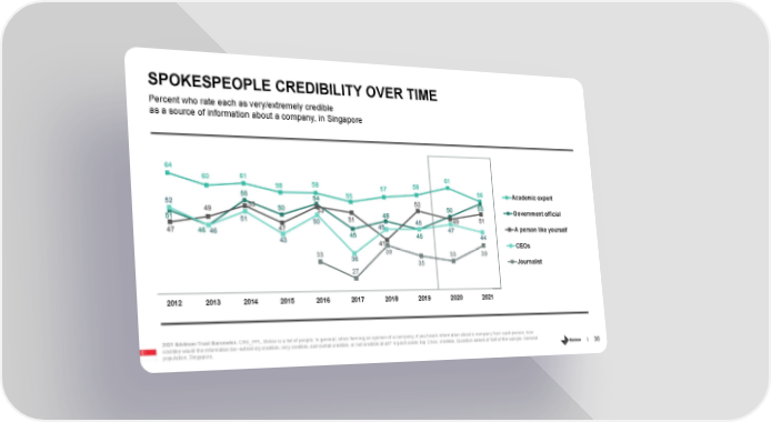 SPOKESPEOPLE CREDIBILITY OVER TIME Percent who rate each as very/extremely credible as a source of information about a company, in Singapore 64 61 61 60 58 58 58 57 56 Academic expert 55 55 54 52 52 53 55 50 50 49 53 Government official 48 51 51 51 51 49 50 45 45 47 A person like yourself 47 47 46 46 45 45 44 43 41 CEOs 39 33 39 33 36 Journalist 35 27 2012 2013 2014 2015 2016 2017 2018 2019 2020 2021 2021 Edelman Trust Barometer. CRE_PPL. Below is a list of people. In general, when forming an opinion of a company, if you heard information about a company from each person, how credible would the information be--extremely credible, very credible, somewhat credible, or not credible at all? 4-point scale; top 2 box, credible. Question asked of half of the sample. General 36 population, Singapore.
