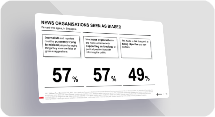 NEWS ORGANISATIONS SEEN AS BIASED Percent who agree, in Singapore Journalists and reporters Most news organisations The media is not doing well at could be purposely trying are more concerned with being objective and non- partisan to mislead people by saying supporting an ideology or things they know are false or political position than with gross exaggerations informing the public 57% 57% 49% 2021 Edelman Trust Barometer. POP_EMO. Some people say they worry about many things while others say they have few concerns. We are interested in what you worry about. Specifically, how much do you worry about each of the following? 9-point scale; top 4 box, worry. Attributes shown to half of the sample. ATT_MED_AGR. Below is a list of statements. For each one, please rate how much you agree or disagree with that statement. 9-point scale; top 4 box, agree. Question asked of half of the sample. PER_MED. How well do you feel the media is currently doing each of the 18 following? Please indicate your answer using the 5-point scale below. 5-point scale; bottom 3 box, not doing well. Question asked of half of the sample. General population, Singapore.