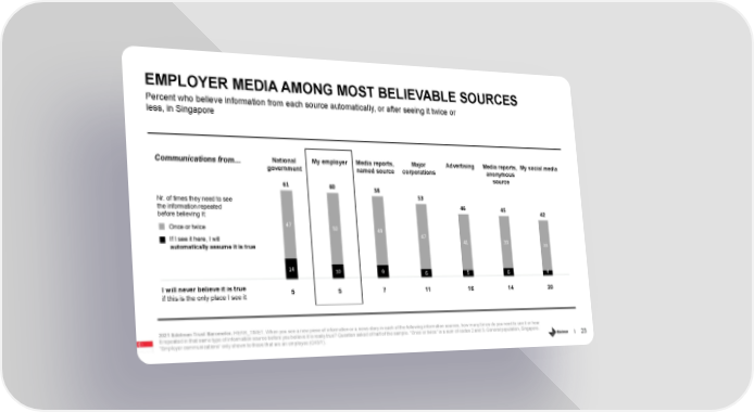 EMPLOYER MEDIA AMONG MOST BELIEVABLE SOURCES Percent who believe information from each source automatically, or after seeing it twice or less, in Singapore National My employer Media reports, Major Advertising Media reports, My social media Communications from… government named source corporations anonymous source 61 60 58 53 Nr. of times they need to see 46 the information repeated 45 42 before believing it: 47 Once or twice 50 49 47 If I see it here, I will 41 39 38 automatically assume it is true 14 10 9 6 5 6 4 I will never believe it is true 5 5 7 11 16 14 20 if this is the only place I see it 2021 Edelman Trust Barometer. HEAR_TIME1. When you see a new piece of information or a news story in each of the following information sources, how many times do you need to see it or hear it repeated in that same type of information source before you believe it is really true? Question asked of half of the sample. “Once or twice” is a sum of codes 2 and 3. General population, Singapore. 23 “Employer communications” only shown to those that are an employee (Q43/1).