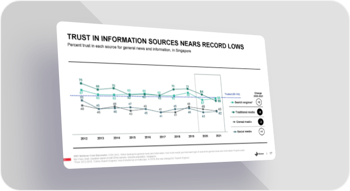TRUST IN INFORMATION SOURCES NEARS RECORD LOWS Percent trust in each source for general news and information, in Singapore 75 70 71 70 68 63 64 64 Change 62 Trusted (60-100) 67 66 2020-2021 63 59 55 62 62 62 62 62 56 +2 Search engines* 57 48 48 47 45 45 45 45 49 43 41 46 45 46 Traditional media -8 45 42 43 41 41 41 Owned media -2 Social media +1 2012 2013 2014 2015 2016 2017 2018 2019 2020 2021 2021 Edelman Trust Barometer. COM_MCL. When looking for general news and information, how much would you trust each type of source for general news and information? 9-point scale; top 4 box, trust. Question asked of half of the sample. General population, Singapore. 17 *From 2012-2015, “Online Search Engines” were included as a media type. In 2016, this was changed to “Search Engines.”