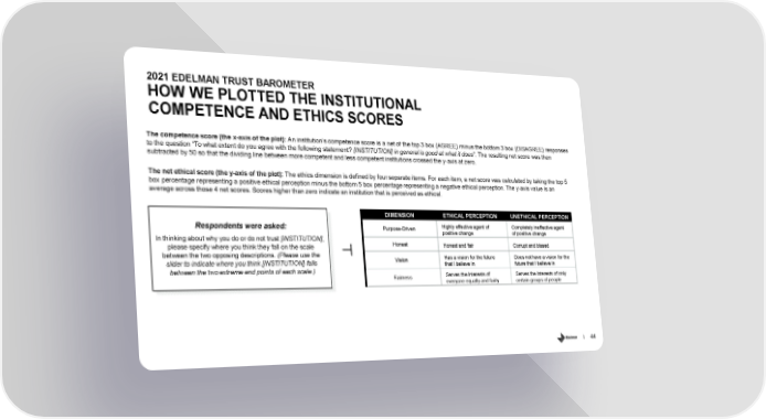 2021 EDELMAN TRUST BAROMETER HOW WE PLOTTED THE INSTITUTIONAL COMPETENCE AND ETHICS SCORES The competence score (the x-axis of the plot): An institution’s competence score is a net of the top 3 box (AGREE) minus the bottom 3 box (DISAGREE) responses to the question “To what extent do you agree with the following statement? [INSTITUTION] in general is good at what it does”. The resulting net score was then subtracted by 50 so that the dividing line between more competent and less competent institutions crossed the y-axis at zero. The net ethical score (the y-axis of the plot): The ethics dimension is defined by four separate items. For each item, a net score was calculated by taking the top 5 box percentage representing a positive ethical perception minus the bottom 5 box percentage representing a negative ethical perception. The y-axis value is an average across those 4 net scores. Scores higher than zero indicate an institution that is perceived as ethical. DIMENSION ETHICAL PERCEPTION UNETHICAL PERCEPTION Highly effective agent of Completely ineffective agent Respondents were asked: Purpose-Driven positive change of positive change In thinking about why you do or do not trust [INSTITUTION], Honest Honest and fair Corrupt and biased please specify where you think they fall on the scale between the two opposing descriptions. (Please use the Has a vision for the future Does not have a vision for the Vision slider to indicate where you think [INSTITUTION] falls that I believe in future that I believe in between the two extreme end points of each scale.) Serves the interests of Serves the interests of only Fairness everyone equally and fairly certain groups of people 44