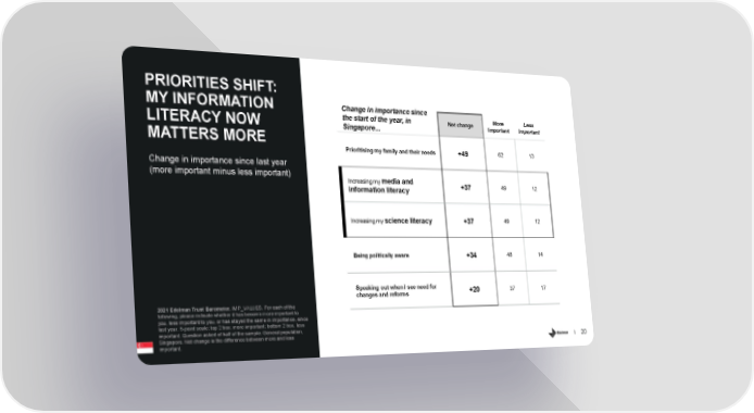 PRIORITIES SHIFT: Change in importance since MY INFORMATION More Less the start of the year, in Net change Important Important LITERACY NOW Singapore... MATTERS MORE Prioritising my family and their needs 62 13 +49 Change in importance since last year (more important minus less important) media and Increasing my 49 12 +37 information literacy 49 12 science literacy +37 Increasing my Being politically aware 48 14 +34 Speaking out when I see need for 37 17 +20 changes and reforms 2021 Edelman Trust Barometer. IMP_VALUES. For each of the following, please indicate whether it has become more important to you, less important to you, or has stayed the same in importance, since last year. 5-point scale; top 2 box; more important; bottom 2 box, less important. Question asked of half of the sample. General population, Singapore. Net change is the difference between more and less 20 important.