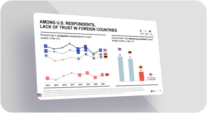 AMONG U.S. RESPONDENTS, LACK OF TRUST IN FOREIGN COUNTRIES Distrust Neutral Trust (1-49) (50-59) (60-100) Percent trust in companies headquartered in each Percent trust in the national government of each country, in the U.S. foreign country, in the U.S. 70 69 66 65 65 62 61 59 58 58 58 56 55 51 54 52 51 21 29 26 26 22 22 U.S. not shown to U.S. respondents 2014 2015 2016 2017 2018 2019 2020 2021 2021 Edelman Trust Barometer. TRU_NAT. Now we would like to focus on global companies headquartered in specific countries. Please indicate how much you trust global companies headquartered in the following countries to do what is right. 9-point scale; top 4 box, trust. Question asked of half of the sample. TRU_GOV. Please indicate how much you trust the national government of each of the following countries to do what is right using a 9-point scale where one means that you “do not trust them at all” and nine means that you “trust them a great deal”. 9- 13 point scale; top 4 box, trust. Question asked of half of the sample. Respondents were not asked to rate their home country. General population, U.S.