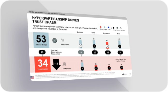 2021 Edelman Trust Barometer U.S. Post-Election Supplement HYPERPARTISANSHIP DRIVES TRUST CHASM - 0 + Percent trust among Biden and Trump voters in the 2020 U.S. Presidential election, Distrust Neutral Trust Change, Nov 2020 – Dec 2020 and change from November to December Business NGOs Government Media 57 55 54 45 0 53 Biden voters TRUST INDEX +3 -1 +2 -3 l Trust gap, Biden voters vs. 19 0 20 15 39 Trump voters Trump voters far less 55 trusting of media -13 34 30 34 18 TRUST INDEX Trump voters -6 -13 -16 -15 l 2021 Edelman Trust Barometer U.S. Post-Election Supplement. The Trust Index is the average percent trust in NGOs, business, government and media.TRU_INS. Below is a list of institutions. For each one, please indicate how much you trust that institution to do what is right. 9-point scale; top 4 box, trust. VOTE. Whom did you vote for in the 2020 United States 11 Presidential election? General population, U.S. among respondents that intended to vote for or did vote for Biden or Trump.