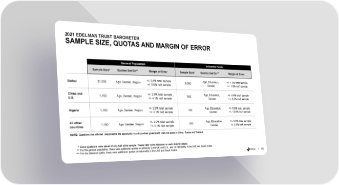 2021 EDELMAN TRUST BAROMETER SAMPLE SIZE, QUOTAS AND MARGIN OF ERROR General Population Informed Public Sample Size* Quotas Set On** Margin of Error Sample Size* Quotas Set On*** Margin of Error +/- 0.6% total sample Age, Education, +/- 1.3% total sample Global 31,050 Age, Gender, Region 6,000 +/- 0.8% half sample Gender +/- 1.8% half sample China and +/- 2.9% total sample Age, Education, +/- 4.4% total sample 1,150 Age, Gender, Region 500 U.S. +/- 4.1% half sample Gender +/- 6.2% half sample +/- 2.9% total sample Age, Education, +/- 9.8% total sample Nigeria 1,150 Age, Gender, Region 100 +/- 4.1% half sample Gender +/- 13.9% half sample All other +/- 2.9% total sample Age, Education, +/- 6.9% total sample 1,150 Age, Gender, Region 200 countries +/- 4.1% half sample Gender +/- 9.8% half sample NOTE: Questions that afforded respondents the opportunity to criticize their government were not asked in China, Russia and Thailand. Some questions were asked of only half of the sample. Please refer to the footnotes on each slide for details. * For the general population, there were additional quotas on ethnicity in the UK and U.S., and on nationality in the UAE and Saudi Arabia. ** For the informed public, there were additional quotas on nationality in the UAE and Saudi Arabia. *** 55