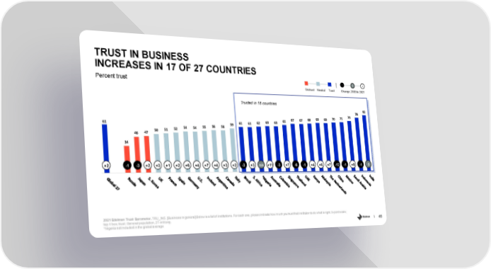 TRUST IN BUSINESS INCREASES IN 17 OF 27 COUNTRIES - 0 + Percent trust Distrust Neutral Trust Change, 2020 to 2021 Trusted in 16 countries 78 82 68 69 69 70 71 73 62 63 63 65 67 67 61 56 56 59 61 61 50 51 52 54 54 55 46 47 34 +2 -1 -3 +2 +3 +1 +2 +6 +4 +7 +4 +3 +2 -3 +3 n/a +11 -3 +7 -6 -1 +4 +6 +7 -12 -1 +8 -1 0 2021 Edelman Trust Barometer. TRU_INS. [Business in general] Below is a list of institutions. For each one, please indicate how much you trust that institution to do what is right. 9-point scale; top 4 box, trust. General population, 27-mkt avg. 46 *Nigeria not included in the global average