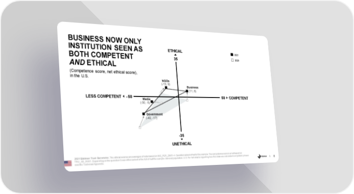 BUSINESS NOW ONLY ETHICAL 2021 INSTITUTION SEEN AS 2020 35 BOTH COMPETENT ANDETHICAL (Competence score, net ethical score), in the U.S. NGOs (-13, 9) Business (11, 6) LESS COMPETENT -50 50 COMPETENT Media (-30, -5) Government (-40, -17) -35 UNETHICAL 2021 Edelman Trust Barometer. The ethical scores are averages of nets based on INS_PER_DIM/1-4. Question asked of half of the sample. The competence score is a net based on TRU_3D_INS/1. Depending on the question it was either asked of the full of half the sample. General population, U.S.For full details regarding how this data was calculated and plotted, please 8 see the Technical Appendix.