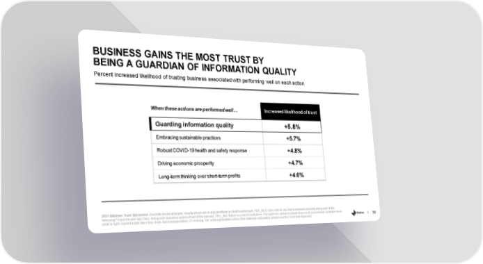 BUSINESS GAINS THE MOST TRUST BY BEING A GUARDIAN OF INFORMATION QUALITY Percent increased likelihood of trusting business associated with performing well on each action When these actions are performed well… Increased likelihood of trust Guarding information quality +5.8% Embracing sustainable practices +5.7% Robust COVID-19 health and safety response +4.8% Driving economic prosperity +4.7% Long-term thinking over short-term profits +4.6% 2021 Edelman Trust Barometer. Discrete choice analysis; results shown are marginal effects on likelihood to trust. PER_BUS. How well do you feel business is currently doing each of the following? 5-point scale; top 2 box, doing well. Question asked of half of the sample. TRU_INS. Below is a list of institutions. For each one, please indicate how much you trust that institution to do 39 what is right. 9-point scale; top 4 box, trust. General population, 27-mkt avg. For a full explanation of how this data was calculated, please see the Technical Appendix.