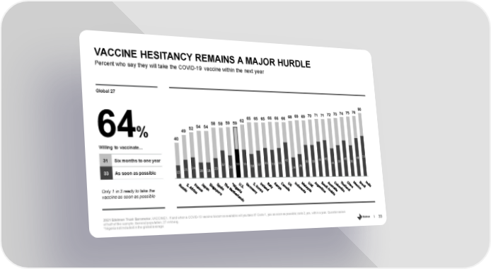 VACCINE HESITANCY REMAINS A MAJOR HURDLE Percent who say they will take the COVID-19 vaccine within the next year Global 27 80 76 75 74 73 72 71 71 70 69 69 68 66 66 66 65 65 65 62 59 59 58 58 54 54 52 49 64% 40 Willing to vaccinate… 43 45 45 48 51 42 31 Six months to one year 32 33 33 32 35 33 35 39 39 35 39 39 21 24 23 26 28 24 28 15 18 18 33 As soon as possible Only 1 in 3 ready to take the vaccine as soon as possible 2021 Edelman Trust Barometer.VACCINE1. If and when a COVID-19 vaccine becomes available will you take it? Code 1, yes as soon as possible; code 2, yes, within a year. Question asked of half of the sample. General population, 27-mkt avg. 33 *Nigeria not included in the global average