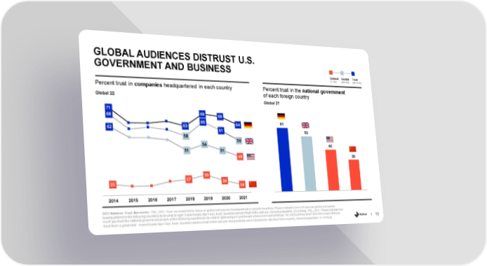 GLOBAL AUDIENCES DISTRUST U.S. GOVERNMENT AND BUSINESS Distrust Neutral Trust (1-49) (50-59) (60-100) Percent trust in companies headquartered in each country Percent trust in the national government of each foreign country Global 22 Global 27 71 69 68 68 65 61 64 63 62 61 53 58 56 54 40 51 51 48 30 39 37 36 35 34 2014 2015 2016 2017 2018 2019 2020 2021 2021 Edelman Trust Barometer. TRU_NAT. Now we would like to focus on global companies headquartered in specific countries. Please indicate how much you trust global companies headquartered in the following countries to do what is right. 9-point scale; top 4 box, trust. Question asked of half of the sample. General population, 22-mkt avg. TRU_GOV. Please indicate how much you trust the national government of each of the following countries to do what is right using a 9-point scale where one means that you “do not trust them at all” and nine means that you 12 “trust them a great deal”. 9-point scale; top 4 box, trust. Question asked of half of the sample. Respondents were not asked to rate their home country. General population, 27-mkt avg.