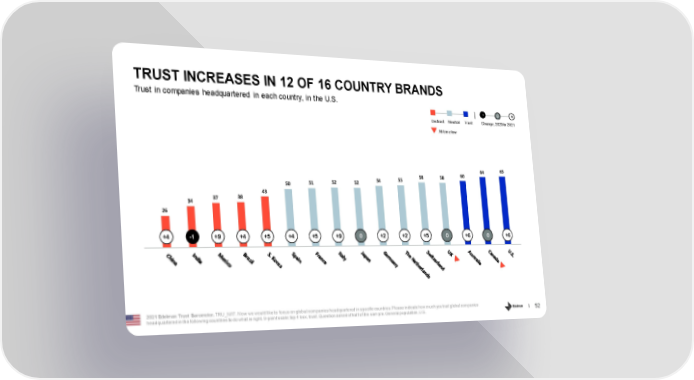 TRUST INCREASES IN 12 OF 16 COUNTRY BRANDS Trust in companies headquartered in each country, in the U.S. + - 0 Distrust Neutral Trust Change, 2020 to 2021 All-time low 60 64 65 54 55 58 58 50 51 52 52 38 43 34 37 26 +4 -1 +9 +4 +5 +4 +5 +9 0 +2 +2 +5 0 +6 0 +6 2021 Edelman Trust Barometer. TRU_NAT. Now we would like to focus on global companies headquartered in specific countries. Please indicate how much you trust global companies 52 headquartered in the following countries to do what is right. 9-point scale; top 4 box, trust. Question asked of half of the sample. General population, U.S.