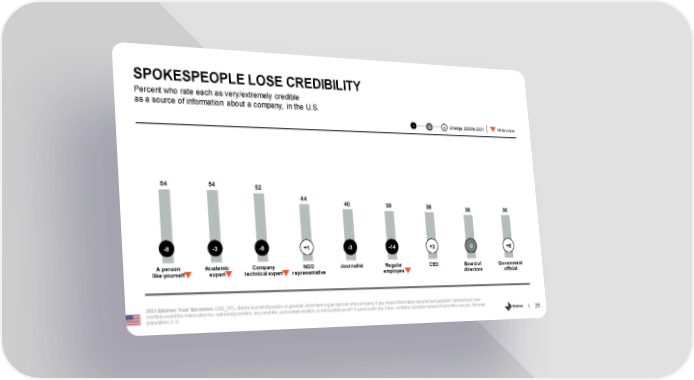 SPOKESPEOPLE LOSE CREDIBILITY Percent who rate each as very/extremely credible as a source of information about a company, in the U.S. - 0 + Change, 2020 to 2021 All-time low 54 54 52 44 40 39 38 36 36 -8 -3 -8 +1 -3 -14 +2 0 +8 l l A person Academic Company NGO Journalist Regular CEO Board of Government like yourself expert technical expert representative employee directors official 2021 Edelman Trust Barometer. CRE_PPL. Below is a list of people. In general, when forming an opinion of a company, if you heard information about a company from each person, how credible would the information be--extremely credible, very credible, somewhat credible, or not credible at all? 4-point scale; top 2 box, credible. Question asked of half of the sample. General 25 population, U.S.