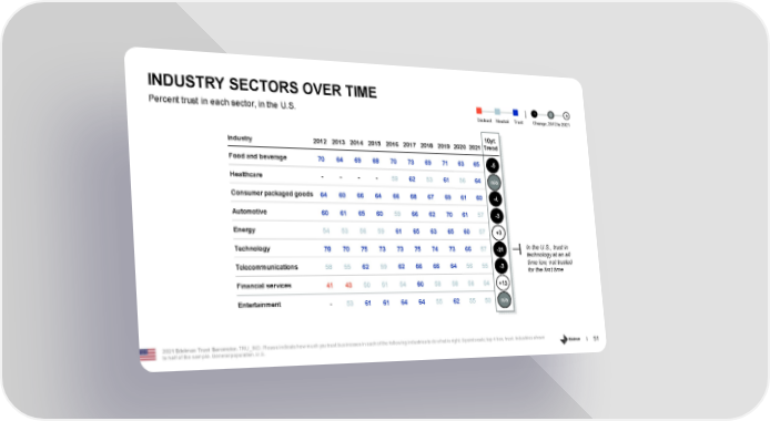 INDUSTRY SECTORS OVER TIME + - 0 Percent trust in each sector, in the U.S. Distrust Neutral Trust Change, 2012 to 2021 10yr. Industry 2012 2013 2014 2015 2016 2017 2018 2019 2020 2021 Trend Food and beverage 70 64 69 68 70 73 69 71 63 65 -5 Healthcare - - - - 59 62 53 61 56 64 n/a Consumer packaged goods 64 60 66 64 66 68 67 69 61 60 -4 Automotive 60 61 65 60 59 66 62 70 61 57 -3 Energy 54 53 56 59 61 65 63 65 60 57 +3 In the U.S., trust in Technology 78 70 75 73 73 75 74 73 66 57 -21 technology at an all time low; not trusted Telecommunications 58 55 62 59 62 66 66 64 56 55 -3 for the first time Financial services 41 43 50 51 54 60 58 58 56 54 +13 Entertainment - 53 61 61 64 64 55 62 55 50 n/a 2021 Edelman Trust Barometer. TRU_IND. Please indicate how much you trust businesses in each of the following industries to do what is right. 9-point scale; top 4 box, trust. Industries shown 51 to half of the sample. General population, U.S.