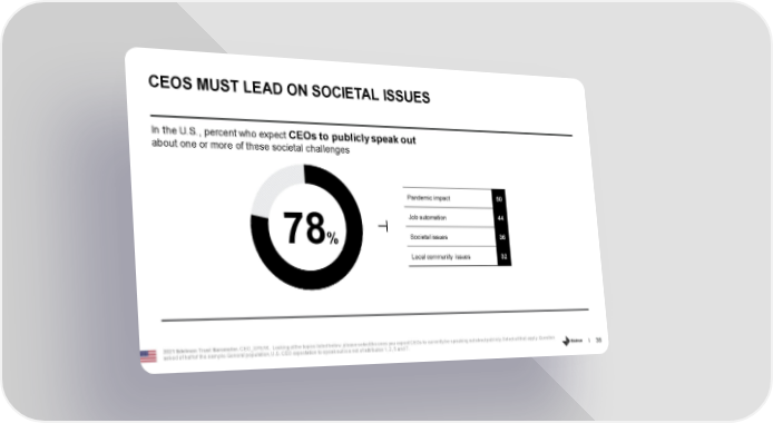 CEOS MUST LEAD ON SOCIETAL ISSUES In the U.S., percent who expect CEOs to publicly speak out about one or more of these societal challenges Pandemic impact 50 Job automation 44 Societal issues 36 78% Local community issues 32 2021 Edelman Trust Barometer.CEO_SPEAK. Looking at the topics listed below, please select the ones you expect CEOs to currently be speaking out about publicly.Select all that apply. Question asked of half of the sample. General population, U.S. CEO expectation to speak out is a net of attributes 1, 2, 5 and 7. 38