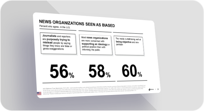 NEWS ORGANIZATIONS SEEN AS BIASED Percent who agree, in the U.S. Journalists and reporters Most news organizations The media is notdoing well at are purposely trying to are more concerned with being objective and non- partisan mislead people by saying supporting an ideology or things they know are false or political position than with gross exaggerations informing the public 56% 58% 60% 2021 Edelman Trust Barometer.POP_EMO. Some people say they worry about many things while others say they have few concerns. We are interested in what you worry about. Specifically, how much do you worry about each of the following? 9-point scale; top 4 box, worry. Attributes shown to half of the sample.ATT_MED_AGR. Below is a list of statements. For each one, please rate how much you agree or disagree with that statement. 9-point scale; top 4 box, agree. Question asked of half of the sample.PER_MED. How well do you feel the media is currently doing each of the following? Please indicate your answer using the 5-point scale below. 5-point scale; bottom 3 box, not doing well. Question asked of half of the sample. General population, U.S. 28