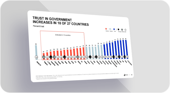 TRUST IN GOVERNMENT INCREASES IN 18 OF 27 COUNTRIES - 0 + Percent trust Distrust Neutral Trust Change, 2020 to 2021 Distrusted in 13 countries 79 80 82 82 76 65 69 70 59 59 61 53 48 50 50 51 51 42 44 45 34 34 37 38 39 30 33 24 27 +3 n/a +7 -4 0 +1 +4 -6 +4 +2 +3 0 +9 +7 +15 -1 +10 -9 +9 +14 +17 +7 +10 -5 +6 -2 +4 -8 +4 2021 Edelman Trust Barometer. TRU_INS. [Government in general] Below is a list of institutions. For each one, please indicate how much you trust that institution to do what is right. 9-point scale; top 4 box, trust. General population, 27-mkt avg. 48 *Nigeria not included in the global average