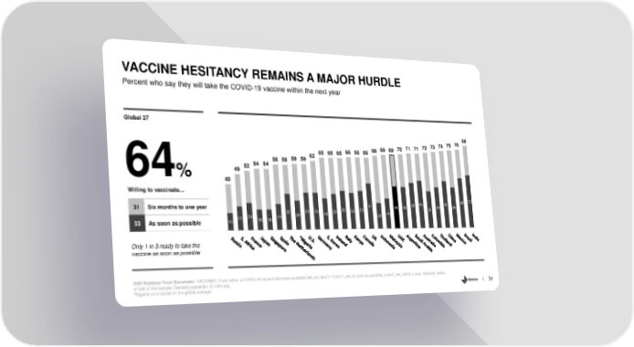 VACCINE HESITANCY REMAINS A MAJOR HURDLE Percent who say they will take the COVID-19 vaccine within the next year Global 27 75 76 80 69 69 70 71 71 72 73 74 65 65 65 66 66 66 68 58 58 59 59 62 64% 49525454 40 Willing to vaccinate… 43 45 45 48 51 31 Six months to one year 35 35 42 39 39 35 39 39 32 26 33 33 28 32 33 28 21 24 18 18 23 24 33 As soon as possible 15 Only 1 in 3 ready to take the vaccine as soon as possible 2021 Edelman Trust Barometer. VACCINE1. If and when a COVID-19 vaccine becomes available will you take it? Code 1, yes as soon as possible; code 2, yes, within a year. Question asked of half of the sample. General population, 27-mkt avg. *Nigeria not included in the global average 31