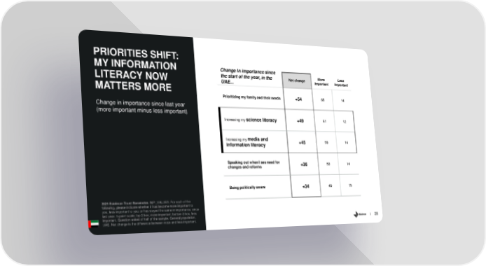 PRIORITIES SHIFT: MY INFORMATION Change in importance since the start of the year, in the Net change More Less LITERACY NOW UAE... Important Important MATTERS MORE Prioritizing my family and their needs +54 68 14 Change in importance since last year (more important minus less important) Increasing my science literacy +49 61 12 Increasing my media and +45 59 14 information literacy Speaking out when I see need for +36 50 14 changes and reforms Being politically aware +34 49 15 2021 Edelman Trust Barometer. IMP_VALUES. For each of the following, please indicate whether it has become more important to you, less important to you, or has stayed the same in importance, since last year. 5-point scale; top 2 box; more important; bottom 2 box, less important. Question asked of half of the sample. General population, UAE. Net change is the difference between more and less important. 28