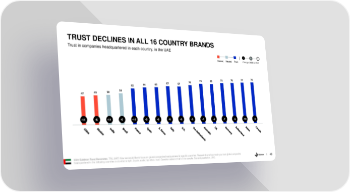 TRUST DECLINES IN ALL 16 COUNTRY BRANDS Trust in companies headquartered in each country, in the UAE - 0 + Distrust Neutral Trust Change, 2020 to 2021 73 73 75 76 77 78 65 67 67 70 62 64 49 50 53 47 -11 -6 -11 -6 -14 -5 -6 -6 -6 -3 -4 -5 -7 -5 -10 -3 2021 Edelman Trust Barometer. TRU_NAT. Now we would like to focus on global companies headquartered in specific countries. Please indicate how much you trust global companies headquartered in the following countries to do what is right. 9-point scale; top 4 box, trust. Question asked of half of the sample. General population, UAE. 49