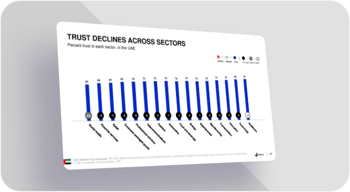 TRUST DECLINES ACROSS SECTORS Percent trust in each sector, in the UAE - 0 + Distrust Neutral Trust Change, 2020 to 2021 77 78 80 81 70 71 72 73 73 74 74 75 66 67 69 63 n/a -3 -7 -5 -9 -6 -5 -7 -4 -5 -1 -6 -6 -4 -3 +2 2021 Edelman Trust Barometer. TRU_IND. Please indicate how much you trust businesses in each of the following industries to do what is right. 9-point scale; top 4 box, trust. Industries shown to half of the sample. General population, UAE. 47