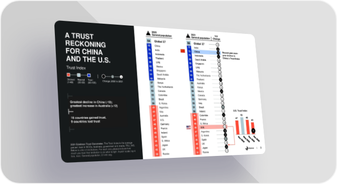 2020 2021 YtY General population General population Change A TRUST 54 Global 27 56 Global 27 +2 RECKONING 82 China 77 India -2 79 India 72 China -10 Record year-over- 73 Indonesia 72 Indonesia -1 year decline in FOR CHINA China’s Trust Index 66 Thailand 69 Saudi Arabia +8 AND THE U.S. 65 UAE 68 Singapore +6 62 Mexico 67 UAE +2 Trust Index 62 Singapore 66 Malaysia +6 61 Saudi Arabia 63 The Netherlands +6 - 0 + 60 Malaysia 61 Thailand -5 Distrust Neutral Trust Change, 2020 to 2021 57 Kenya 59 Australia +12 (1-49) (50-59) (60-100) 59 Kenya +2 57 The Netherlands 53 Canada 59 Mexico -3 53 Colombia 56 Canada +3 51 Brazil 53 Germany +7 Greatest decline in China (-10); 50 S. Korea 52 Italy +3 greatest increase in Australia (+12) 49 Argentina 51 Brazil 0 49 Italy 50 Ireland +5 U.S. Trust Index 16 countries gained trust, 47 Australia 48 Colombia -5 53 9 countries lost trust 47 U.S. 48 France +3 47 48 43 46 Germany 48 S. Africa +4 45 France 48 U.S. +1 45 Ireland 47 Argentina -2 -5 45 Spain 47 S. Korea -3 2021 Edelman Trust Barometer. The Trust Index is the average 44 S. Africa 45 Spain 0 percent trust in NGOs, business, government and media. TRU_INS. 42 Japan 45 UK +3 Below is a list of institutions. For each one, please indicate how 42 UK 40 Japan -2 much you trust that institution to do what is right. 9-point scale; top 4 box, trust. General population, 27-mkt avg. 30 Russia 31 Russia +1 9