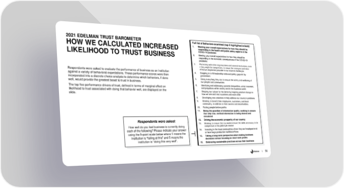 2021 EDELMAN TRUST BAROMETER Full list of behaviors examined (top 5 highlighted in bold) 1. Meeting your overall expectations for how they should be HOW WE CALCULATED INCREASED responding to the health and public safety aspects of the COVID-19 pandemic LIKELIHOOD TO TRUST BUSINESS 2. Meeting your overall expectations for how they should be responding to the economic consequences of the COVID-19 pandemic 3. Partnering with other organizations and societal institutions, even if they might be competitors, to mount the strongest and most Respondents were asked to evaluate the performance of business as an institution effective responses possible to our societal challenges against a variety of behavioral expectations. These performance scores were then 4. Stepping in to fill leadership voids and policy gaps left by government incorporated into a discrete choice analysis to determine which behaviors, if done 5. Doing everything they can to ensure the safety and wellbeing of people and communities well, would provide the greatest boost to trust in business. our The top five performance drivers of trust, defined in terms of marginal effect on 6. Identifying and addressing systemic inequalities, unfair treatment, ejudices within society and in the business world likelihood to trust associated with doing that behavior well, are displayed on the and pr slide. 7. Shaping our culture for the better by inspiring positive change in we see and treat ourselves and each other how 8. Developing new solutions to help address our country’s problems 9. Working to benefit their employees, customers, and local community, in addition to their owners and shareholders 10. Putting people before profits 11. Being the guardian of information quality, working to ensure hat only true, verified information is being shared and t circulated Respondents were asked: 12. Driving the economic prosperity of our country 13. Working to ensure that our workers have the skills necessary to be How well do you feel business is currently doing competitive in the global job market each of the following? Please indicate your answer 14. Investing in the local communities where they are headquartered have large production facilities/offices using the 5-point scale below where 1 means the or erm perspective when making business institution is “failing at this” and 5 means the 15. Taking a long-t institution is “doing this very well”. decisions versus focusing on short-term profits 16. Embracing sustainable practices across their business 56