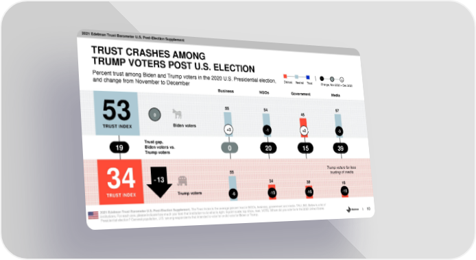2021 Edelman Trust Barometer U.S. Post-Election Supplement TRUST CRASHES AMONG TRUMP VOTERS POST U.S. ELECTION Percent trust among Biden and Trump voters in the 2020 U.S. Presidential election, - 0 + Distrust Neutral Trust Change, Nov 2020 – Dec 2020 and change from November to December Business NGOs Government Media 55 54 57 53 0 45 TRUST INDEX Biden voters +3 -1 +2 -3 Trust gap, 19 Biden voters vs. 0 20 15 39 Trump voters 55 Trump voters far less -13 trusting of media 34 34 30 18 TRUST INDEX Trump voters -6 -13 -16 -15 2021 Edelman Trust Barometer U.S. Post-Election Supplement. The Trust Index is the average percent trust in NGOs, business, government and media. TRU_INS. Below is a list of institutions. For each one, please indicate how much you trust that institution to do what is right. 9-point scale; top 4 box, trust. VOTE. Whom did you vote for in the 2020 United States Presidential election? General population, U.S. among respondents that intended to vote for or did vote for Biden or Trump. 10