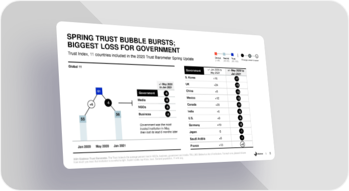 SPRING TRUST BUBBLE BURSTS; BIGGEST LOSS FOR GOVERNMENT - 0 + Distrust Neutral Trust Change, wave to wave Trust Index, 11 countries included in the 2020 Trust Barometer Spring Update (1-49) (50-59) (60-100) Global 11 Government +/- Jan 2020 to +/- May 2020 to May 2020 Jan 2021 S. Korea -17 +16 -17 UK -15 +/- May 2020 +24 -15 to Jan 2021 China -13 61 Government -8 +5 -13 -8 Mexico -12 Media -6 +12 -12 -5 -6 Canada -11 +6 NGOs -6 +20 -11 -6 India +6 -8 56 Business -3 -8 -3 U.S. -6 55 +9 -6 Government was the most Germany -5 trusted institution in May, +19 -5 then lost its lead 6 months later Japan -1 -5 -1 Saudi Arabia -1 +5 -1 Jan 2020 May 2020 Jan 2021 France +2 +13 2 2021 Edelman Trust Barometer. The Trust Index is the average percent trust in NGOs, business, government and media. TRU_INS. Below is a list of institutions. For each one, please indicate how much you trust that institution to do what is right. 9-point scale; top 4 box, trust. General population, 11-mkt avg. 5