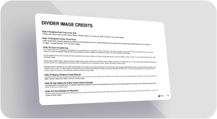 DIVIDER IMAGE CREDITS Slide 4 Pandemic Puts Trust to the Test People wear face masks as they wait at Hankou Railway Station on January 22, 2020 in Wuhan, China: Getty Images Slide 13 Pandemic Further Fuels Fears Indian paramilitary troopers wearing a protective suit distribute free food for migrant laborers during a government-imposed nationwide lockdown on the outskirts of Srinagar: Tauseef Mustafa / AFP via Getty Images Slide 18 Crisis of Leadership U.S. President Donald Trump speaks in the briefing room at the White House on November 5, 2020 in Washington, DC. Votes are still being counted two days after the presidential election as incumbent Trump is in a close race against challenger Democratic presidential nominee Joe Biden, which remains too close to call: Chip Somodevilla / Getty Images UK Prime Minister Boris Johnson speaks and takes questions during a press conference in Downing Street regarding the coronavirus outbreak, on March 9, 2020. in London, England: Alberto Pezzali / WPA Pool/Getty Images Andres Manuel Lopez Obrador, Mexico's president, speaks during a news conference at the National Palace in Mexico City, Mexico, on Wednesday, Nov. 25, 2020. Lopez Obrador reiterated Wednesday that hell wait until the U.S. presidential election process is fully concluded before he congratulates a winner: Cegarra / Bloomberg via Getty Images President of Brazil Jair Bolsonaro and Health Minister Nelson Teich speak during a press conference to announce Teich as newly appointed Health Minister amidst coronavirus (COVID-19) pandemic at the Planalto Palace on April, 16, 2020 in Brasilia. President Bolsonaro has fired outgoing Minister of Health Luiz Henrique Mandetta over differences in coronavirus strategy. Brazil has over 30,000 confirmed positive cases of Coronavirus and 1942 deaths: Andressa Anholete / Getty Images Slide 24 Raging Infodemic Feeds Mistrust A protester holds a placard during the Irish Freedom Party an anti-vaccination and anti-lockdown rally outside the Custom House, on day 39 of the nationwide Level 5 lockdown. On Saturday, November 28, 2020, in Dublin, Ireland: Artur Widak / NurPhoto via Getty Images Slide 30 High Stakes for Public Health and the Economy Local response to Coronavirus is felt on a street-by-street level as restaurants, shops and small businesses are closed up with their shutters pulled down on Ladypool Road in Birmingham, England: Mike Kemp / In Pictures via Getty Images Slide 34 A New Mandate for Business Female cashier working at supermarket attending a woman customer. Woman wearing protective face mask sitting at grocery store checkout counter during covid-19 pandemic talking with a customer. Luis Alvarez via Getty Images 59