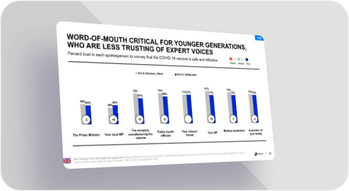 FEB WORD-OF-MOUTH CRITICAL FOR YOUNGER GENERATIONS, WHO ARE LESS TRUSTING OF EXPERT VOICES Percent trust in each spokesperson to convey that the COVID-19 vaccine is safe and effective Distrust Neutral Trust Gen X, Boomers, Silent Gen Z / Millennials 74% 81% 79% 75% 72% 66% 71%71% 71% 72% 73% 61% 46% 44% 43% 38% -3 +6 -11 -8 - -10 -7 -2 The company Public health Your closest Medical academics A member of The Prime Minister Your local MP manufacturing the officials friend Your GP your family vaccine 2021 Edelman Trust Barometer UK supplement. Please indicate how much you trust each of the following people in convincing you that the COVID-19 vaccine is safe and effective? 9 point scale; top 4 Box, trust. Base UK: Gen X, Boomers, Silent (1,263), Gen Millennials (756) 25